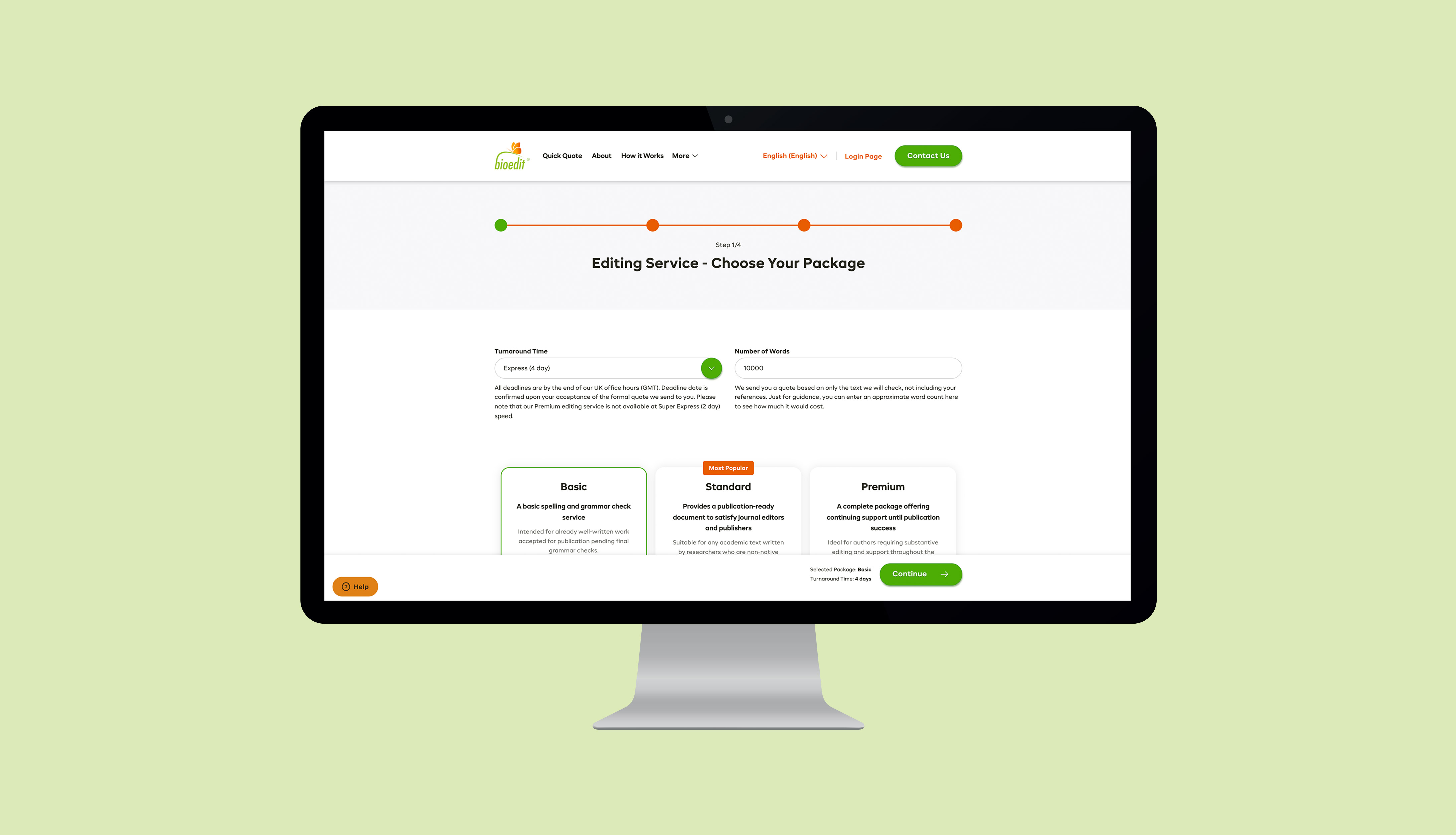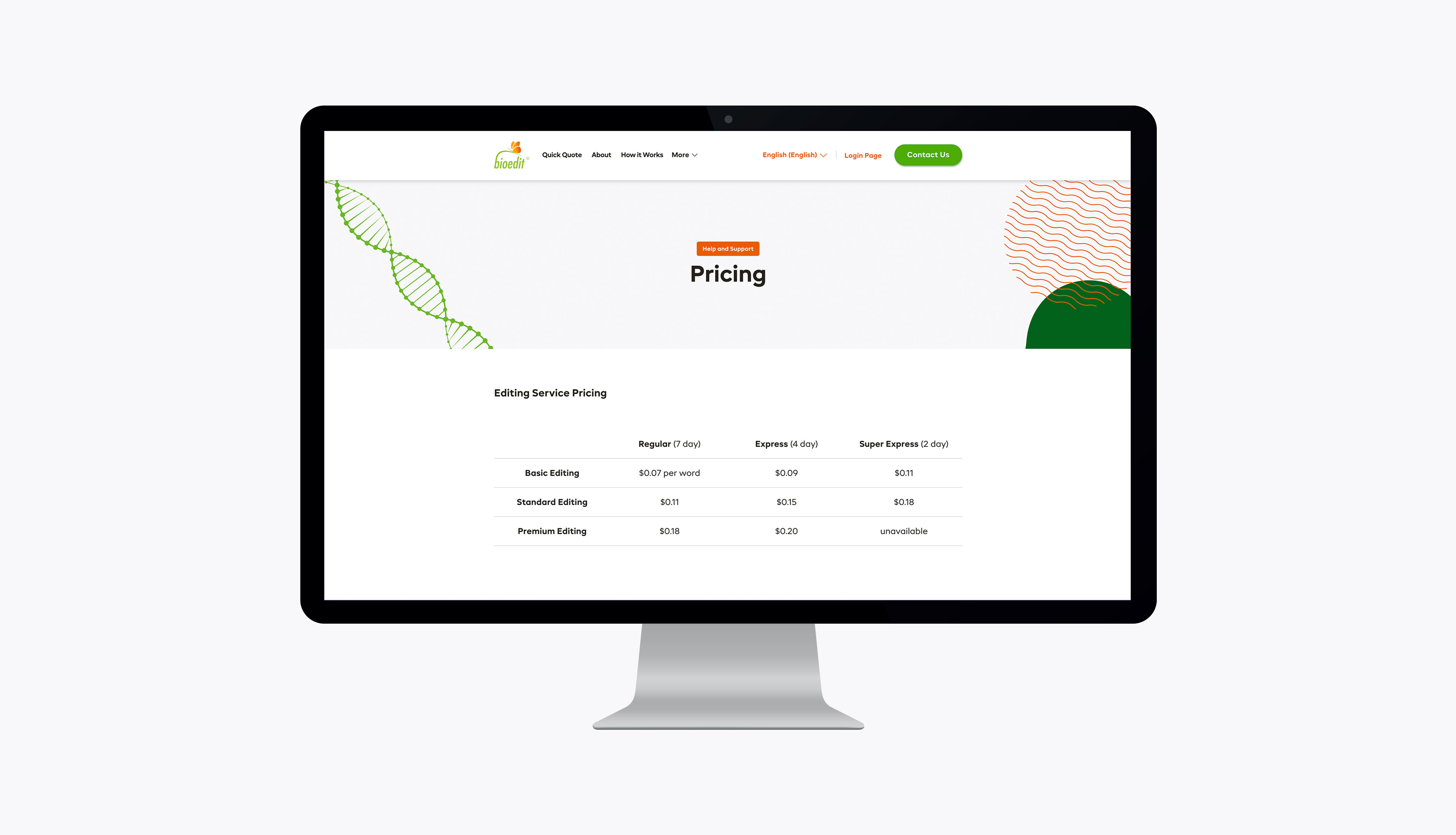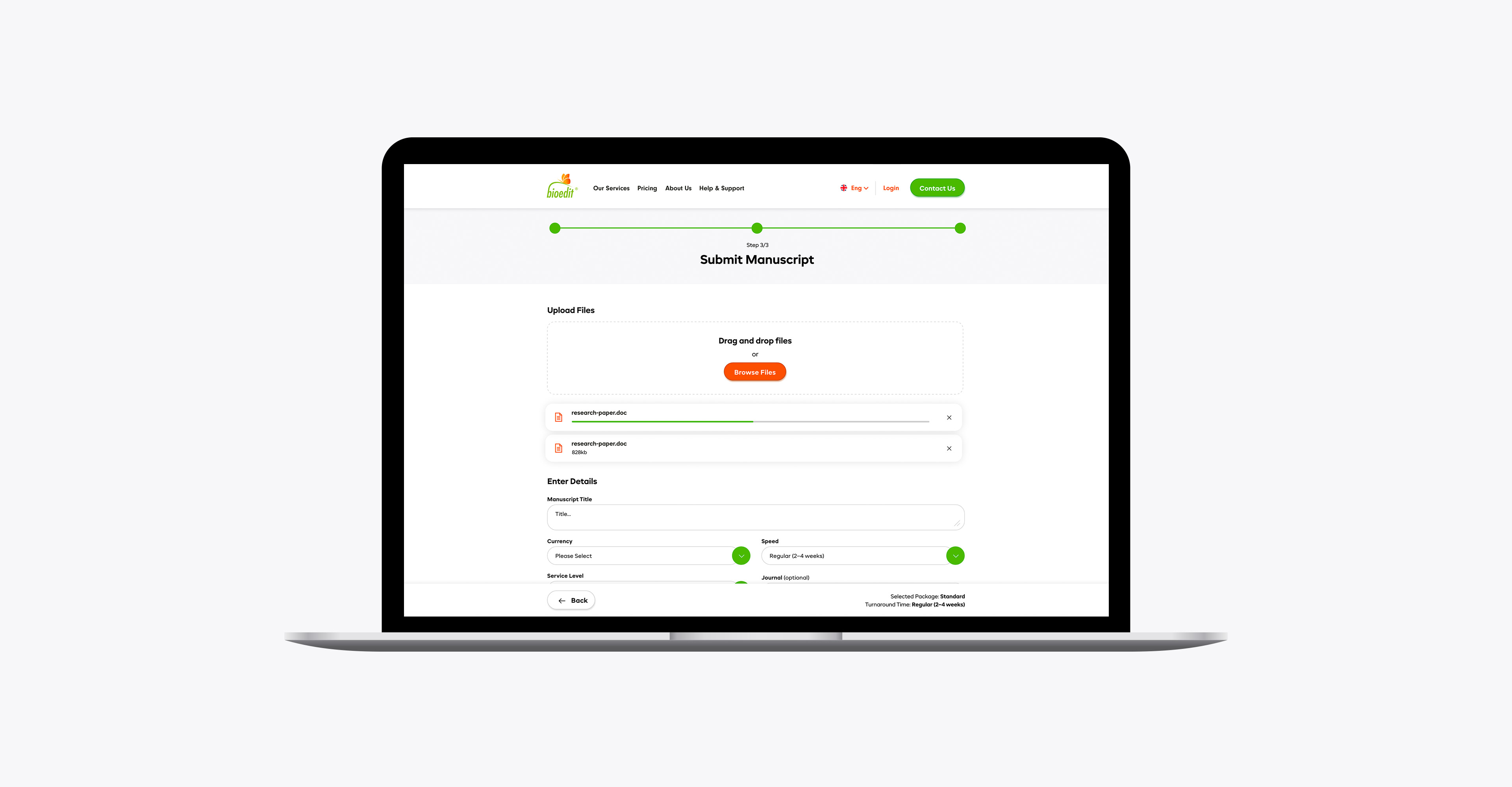 Bioedit offers several different levels of editing services. Authors can choose from one of three distinct service tiers: ‘basic’, ‘standard’, or ‘premium’, in addition to their required turnaround time of either ‘2 days’, ‘4 days’, or ‘7 days’. Furthermore, authors can opt for supplementary features including ‘pre-peer review service’ and ‘plagiarism check’. These packages and options are created by Bioedit’s internal team inside the new back-office admin.