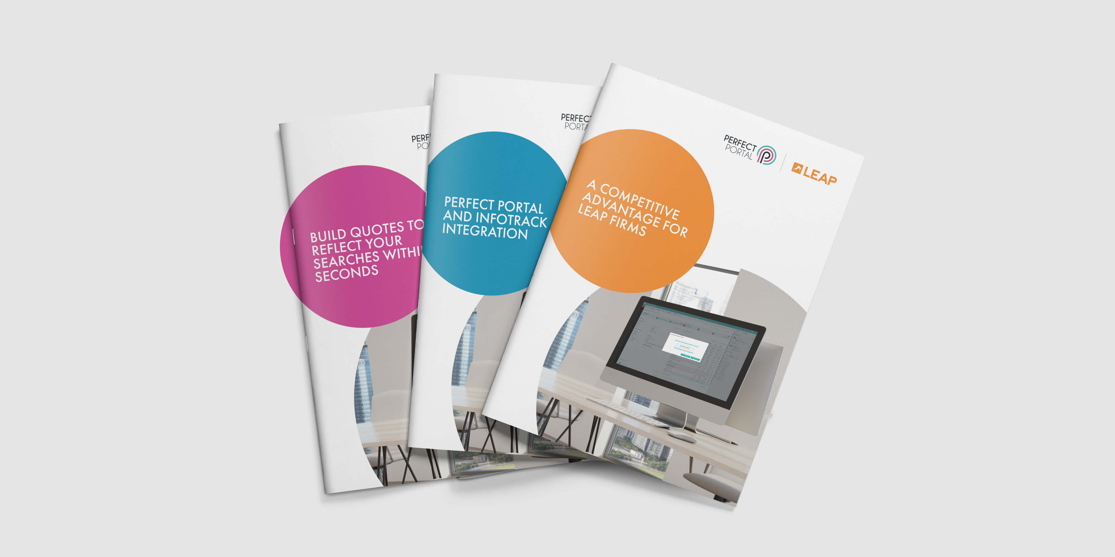 The aim of the product leaflet is to promote the additional functionality provided by Perfect Portal in partnership with third-party software applications including LEAP, InfoTrack and Tikit P4W. Therefore, the leaflets needed to be dual branded; they had to incorporate the same look and feel as the main brochure, whilst also allowing Perfect Portal to tailor the leaflet to each of their partners. We cropped the circular device into the front-cover, which gives Perfect Portal the opportunity to differentiate each leaflet and inject some personality! Furthermore, we supplied the client with a templated design, enabling them to add and update the copy.
