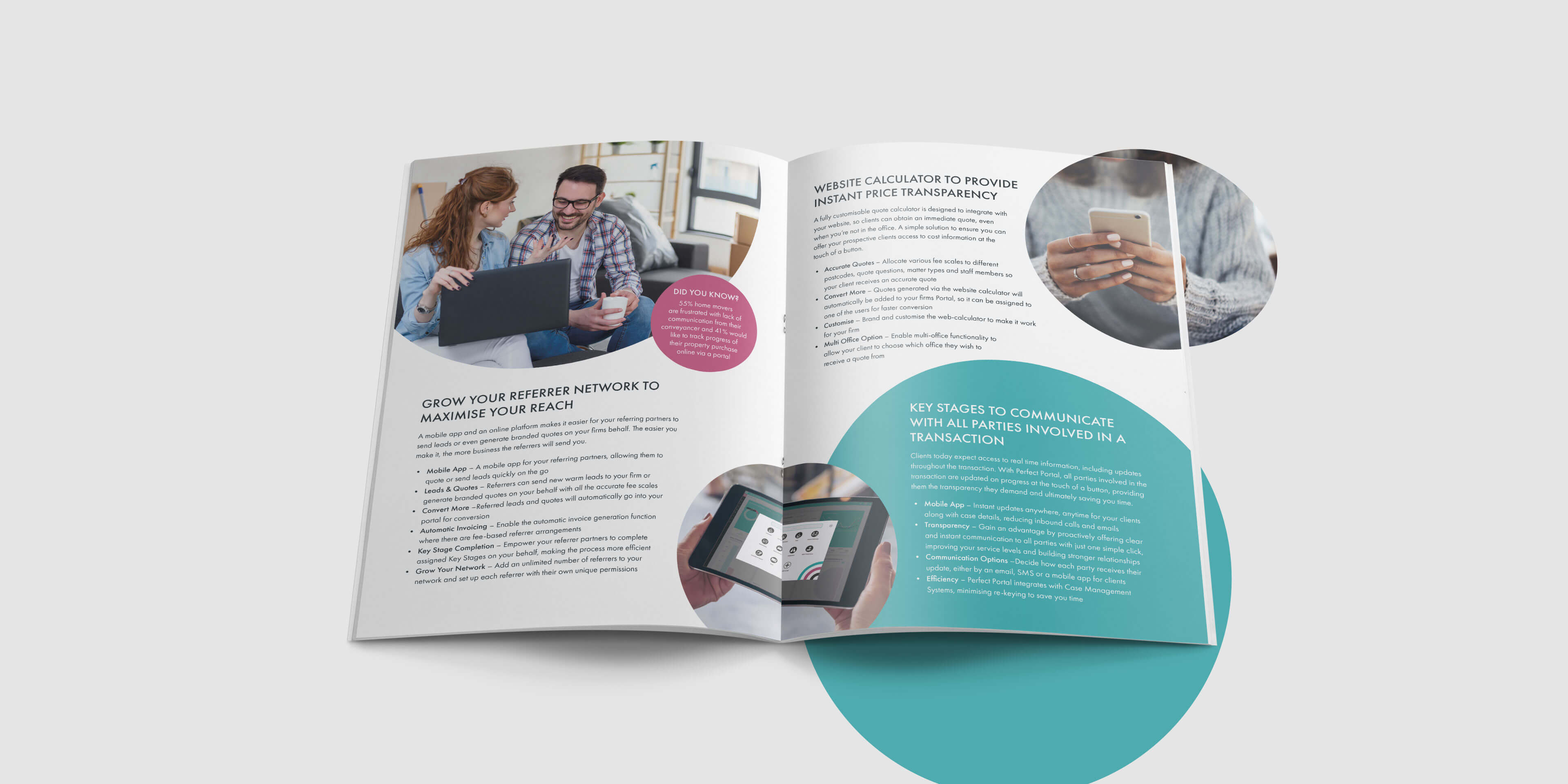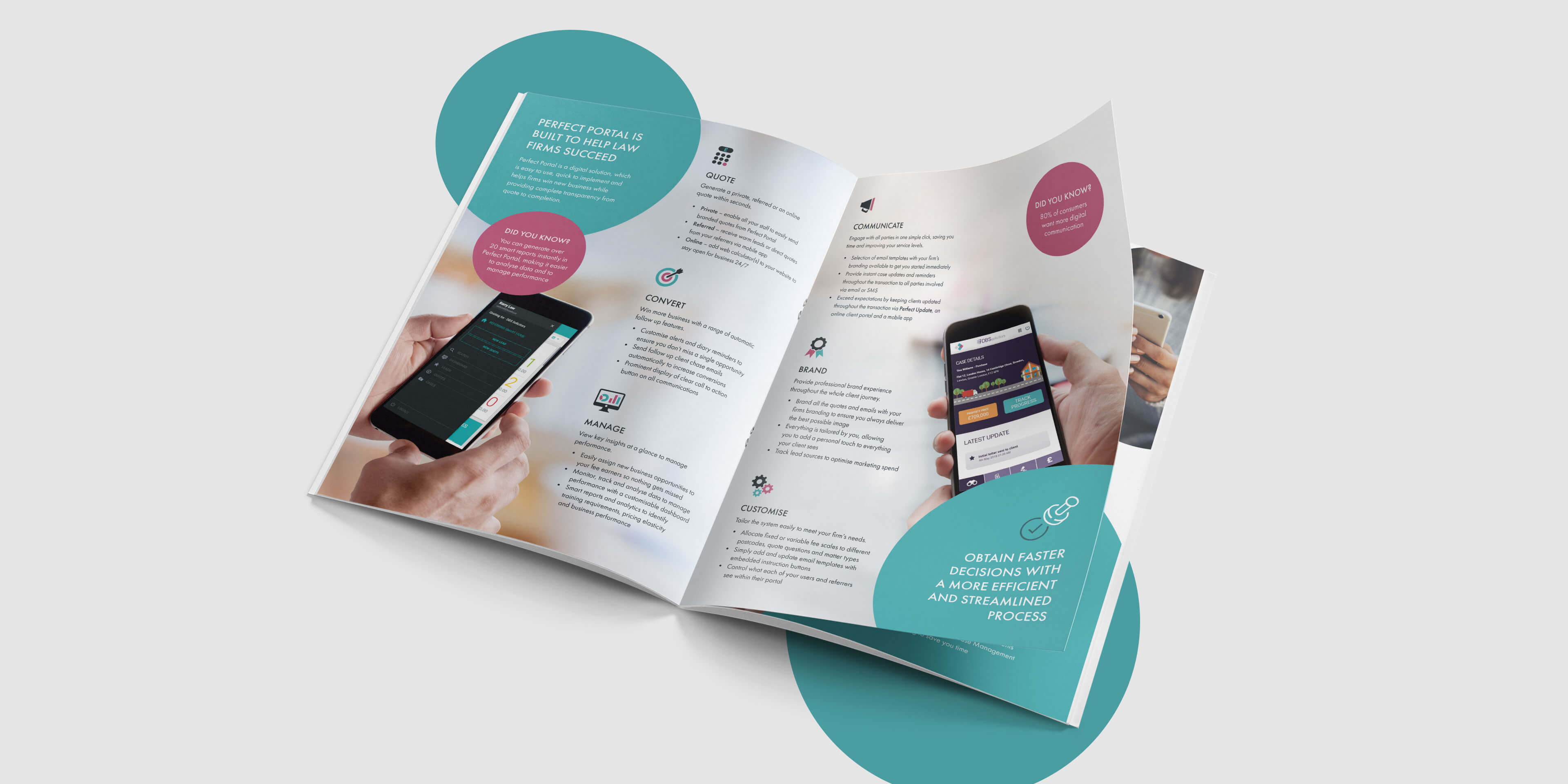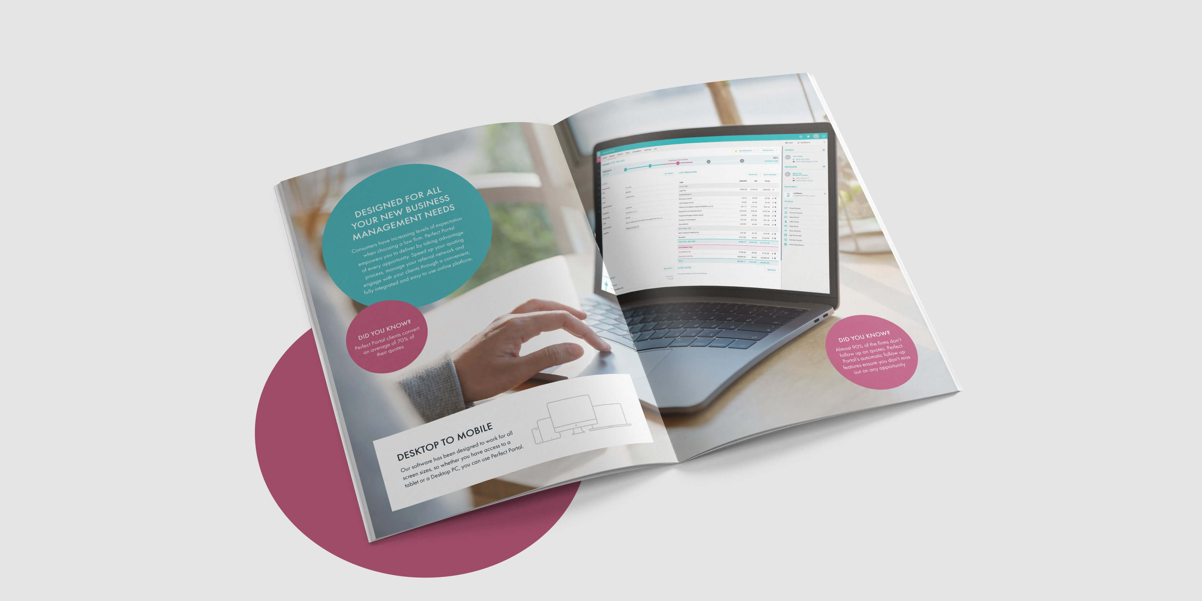 Perfect Portal is a professional and clean, yet friendly and dynamic brand. Our designers embraced the brand’s personality by scaling up circular shapes from the logo and employing them as a device to frame text and images throughout the brochure. The shapes also provided us with a way to attract attention to key messages. As part of the project, we created custom graphics including mocked-up photography of people using the portal on mobile and desktop devices. Perfect Portal now have a tangible marketing asset to complement their digital presence. The brochure effectively communicates the service to prospective law firms in an informative and engaging manner, whilst retaining the core brand treats; clean, modern and professional.